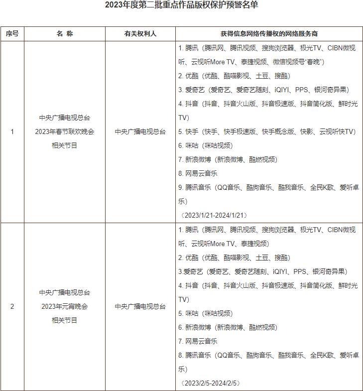 按照国家版权局《关于进一步加强互联网传播作品版权监管工作的意见》及版权重点监管工作计划,根据相关权利人上报的作品授权情况,现公布2023年度第二批重点作品星空体育app下载官网预警名单。