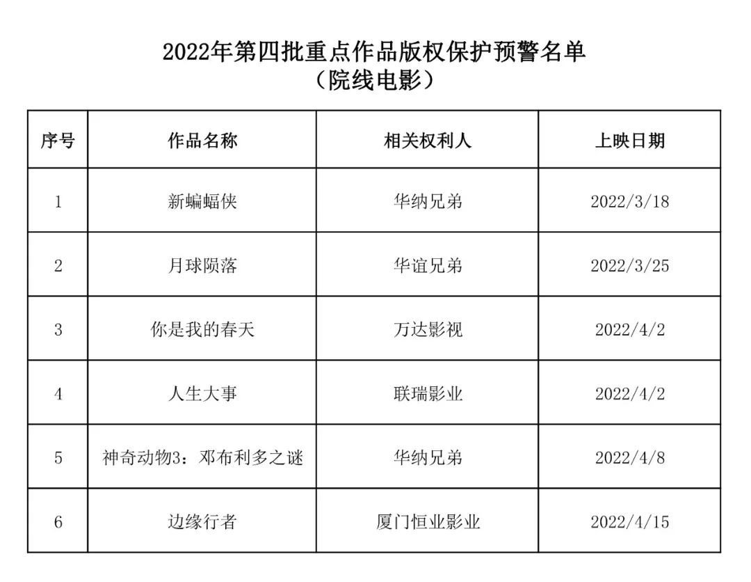 按照国家版权局《关于进一步做好院线电影星空体育app下载官网工作的通知》及版权重点监管工作计划,根据相关权利人上报的作品授权情况,现公布2022年度第四批重点作品星空体育app下载官网预警名单。